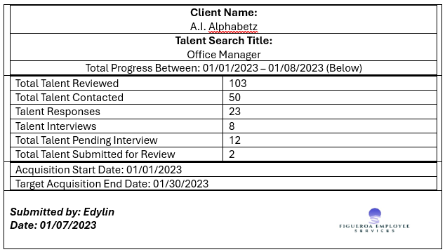 Please note: requisition and/or order progress reports vary on a case by case basis. To protect the privacy of F.E.S. (Figueroa Employee Services) industry knowledge, not all used steps are detailed in this post. Some rows and columns are neither pictured nor included.